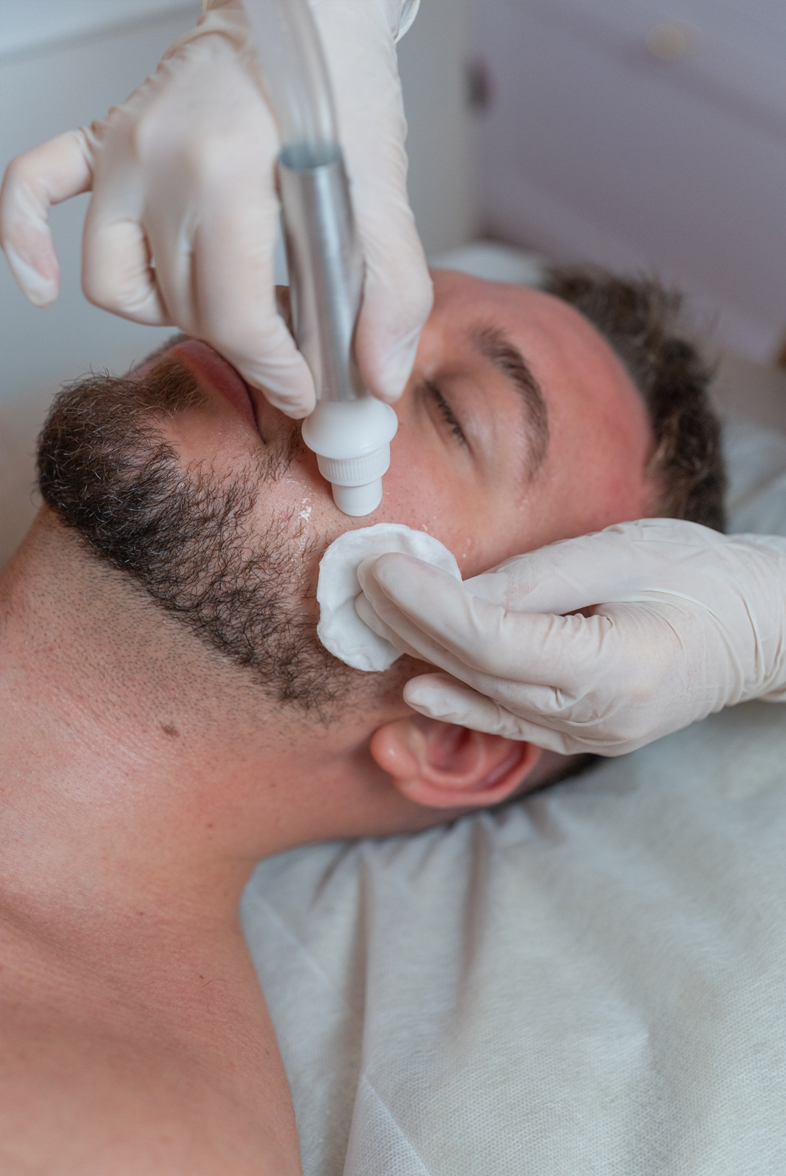 Ein kühler, feiner Strahl aus Sauerstoff und Kochsalzlösung entfernt abgestorbene Zellen, reinigt die Poren und regt die Mikrozirkulation an.